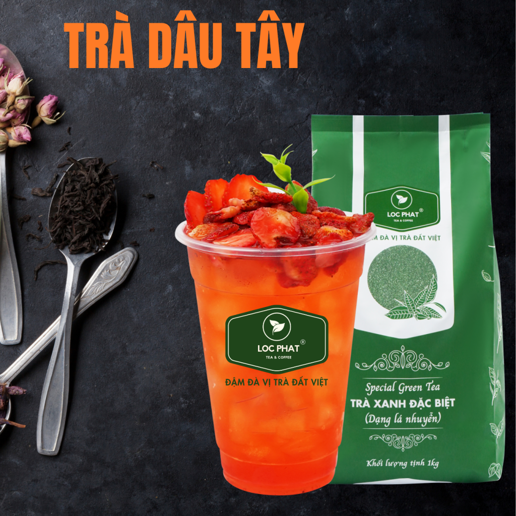 Ly 500ml: 120ml nước cốt trà xanh (145đ) + 10ml siro dâu (800đ) + 15ml sinh tố dâu (1.3k) + 20ml nước đường (520đ) + 2.5ml nước cốt tắc (200đ) + 1 vá topping (2k) + ly, muỗng, ống hút (1.3k) = 6.3k