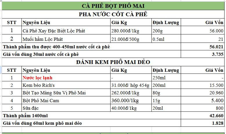 Bước 4 – Thành phẩm: Thu được khoảng 400–450ml nước cốt cà phê đen (56.021đ). Giá vốn dùng 40ml (4.980đ)